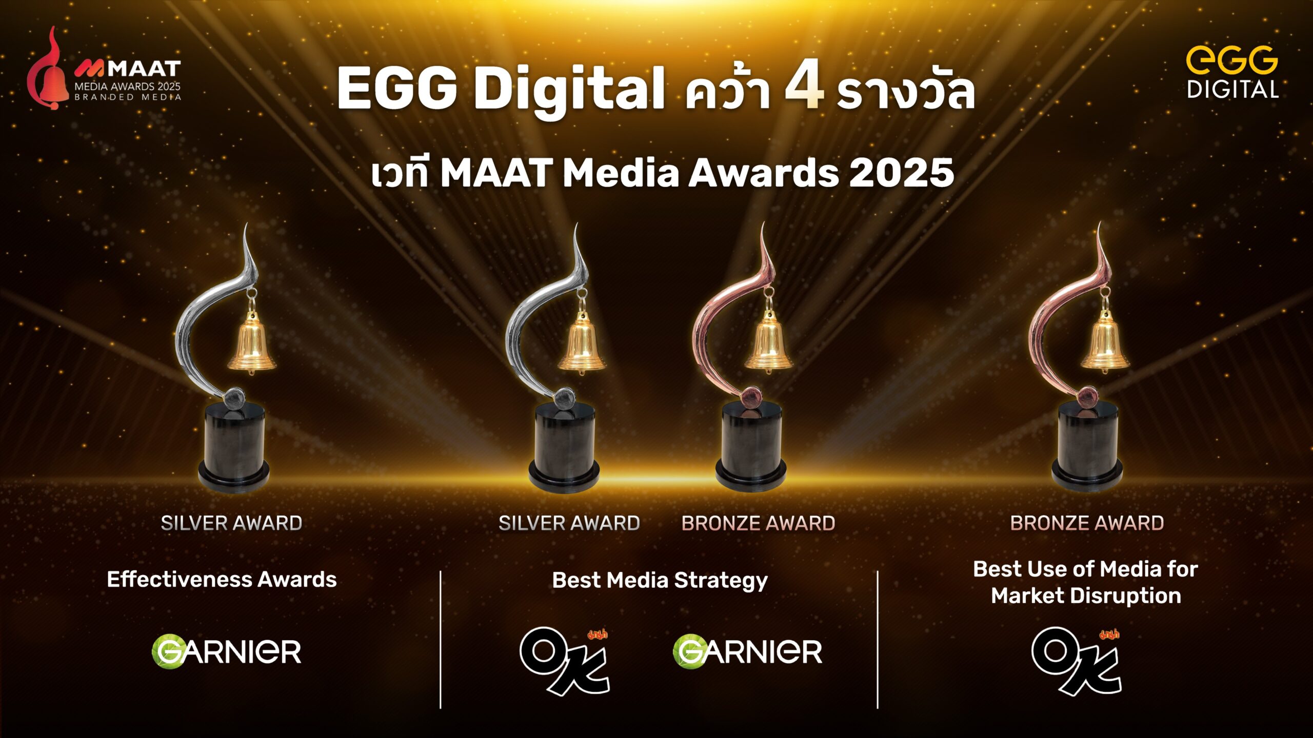 กรุงเทพฯ – เอ้ก ดิจิทัล (EGG Digital) ตอกย้ำศักยภาพในฐานะผู้ให้บริการสื่อโฆษณาครบวงจรแห่งยุคดิจิทัล คว้า 4 รางวัลจากเวทีสื่อโฆษณาระดับประเทศ “MAAT Media Awards 2025” ได้แก่ รางวัลระดับ Silver 2 รางวัล และ  Bronze 2 รางวัล จากแคมเปญ MAMA OK และ  Garnier  (การ์นิเย่) โชว์ความสามารถในการวางกลยุทธ์การสื่อสารและโฆษณาที่ทรงพลัง ผ่านการผสาน “ดาต้า  720  องศา – AI – ครีเอทีฟ  รีเทลมีเดียเน็ตเวิร์ก” ในรูปแบบ  Omnichannel เชื่อมโยงสื่อทุกช่องทางอย่างไร้รอยต่อ สร้างการสื่อสารที่แม่นยำ เข้าถึงผู้บริโภคในทุกทัชพอยท์ พร้อมสร้างโอกาสใหม่และผลลัพธ์ทางธุรกิจที่วัดผลได้ให้กับแบรนด์