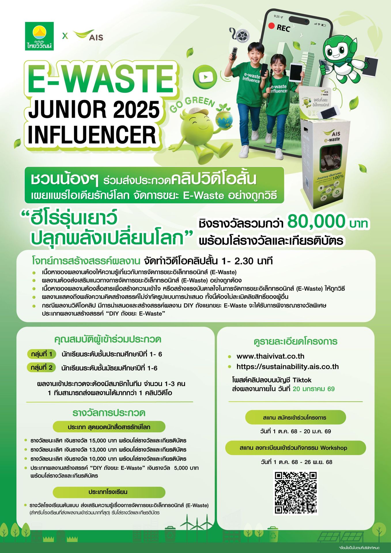 Thaivivat x AIS ขอเชิญนักเรียนประถมศึกษา และมัธยมศึกษา ส่งผลงานเข้าร่วมการประกวดคลิปสั้น “E-WASTE INFLUENCER JUNIOR” ภายใต้แนวคิด “ฮีโร่รุ่นเยาว์ ปลุกพลังเปลี่ยนโลก” ชิงรางวัลรวมกว่า 80,000 บาท พร้อมโล่ และเกียรติบัตร