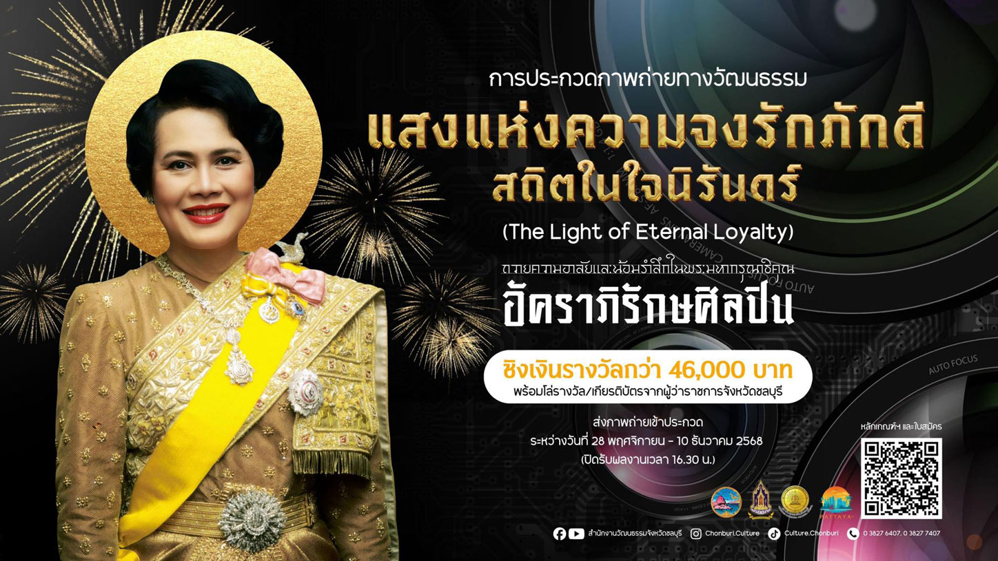 จังหวัดชลบุรี ขอเชิญชวนนักถ่ายภาพทั้งมืออาชีพ มือสมัครเล่น รวมถึงเยาวชน และประชาชนทั่วไปที่มีความ หลงใหลในการถ่ายภาพ ร่วมส่งผลงานเข้าประกวดในโครงการประกวดภาพถ่ายทางวัฒนธรรม “แสงแห่งความจงรักภักดี สถิตในใจนิรันดร์ (The Light of Eternal Loyalty)” ถวายความอาลัยและน้อมรำลึกในพระมหากรุณาธิคุณ “อัคราภิรักษศิลปิน” เพื่อร่วมถ่ายทอด แนวคิดผ่านมุมมองแห่งศิลปะการถ่ายภาพ ชิงเงินรางวัลรวมกว่า 46,000 บาท พร้อมโล่รางวัล และเกียรติบัตรจาก ผู้ว่าราชการจังหวัดชลบุรี