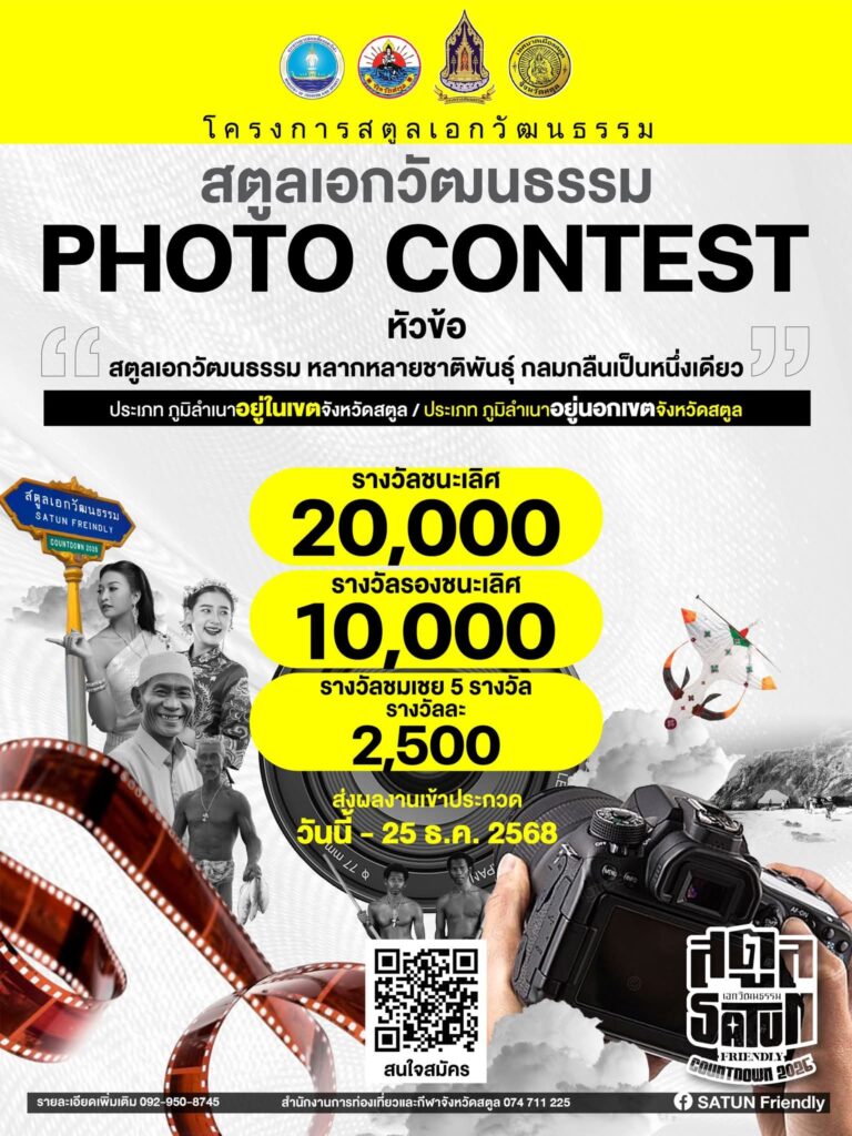 โครงการสตูลเอกวัฒนธรรม ขอเชิญชวนผู้สนใจเข้าร่วมการประกวดภาพถ่าย หัวข้อ “สตูลเอกวัฒนธรรม หลากหลายชาติพันธุ์ กลมกลืนเป็นหนึ่งเดียว” ชิงรางวัลเงินสด พร้อมเกียรติบัตร