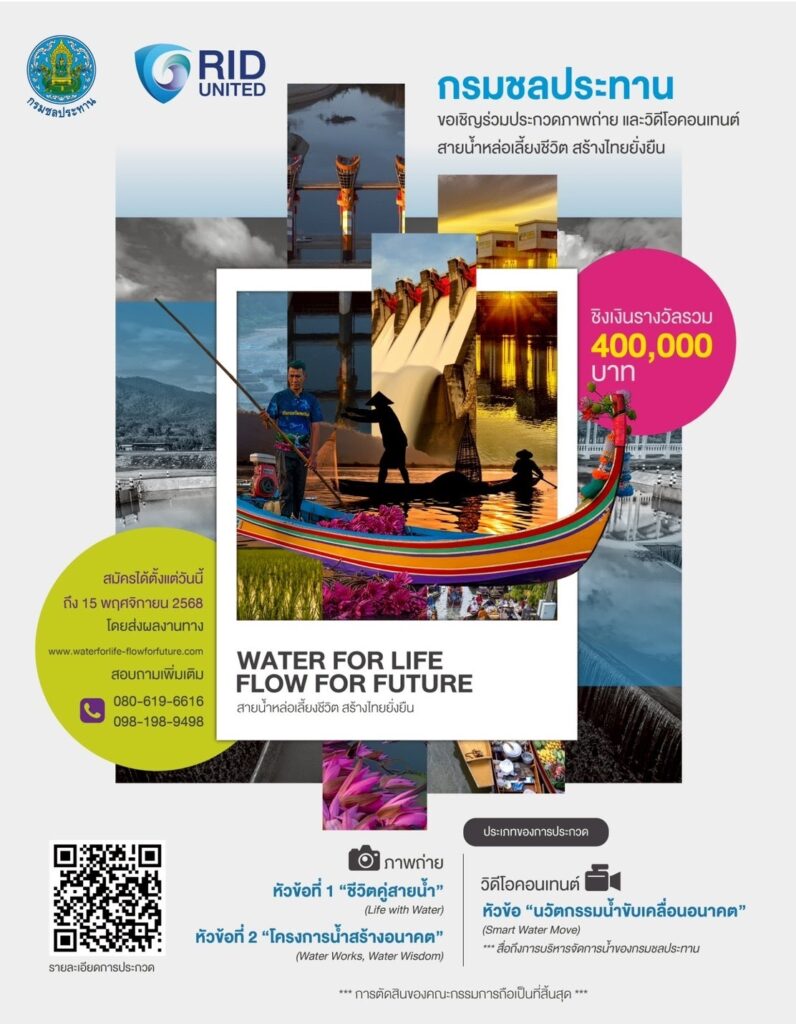 กรมชลประทาน ขอเชิญผู้สนใจ ส่งผลงานเข้าร่วมการประกวดภาพถ่าย และวิดีโอคอนเทนต์งานชลประทาน “สายน้ําหล่อเลี้ยงชีวิต สร้างไทยยั่งยืน : Water for Life, Flow for Future” ชิงเงินรางวัลมูลค่ารวม 400,000 บาท พร้อมโล่ และใบประกาศนียบัตร