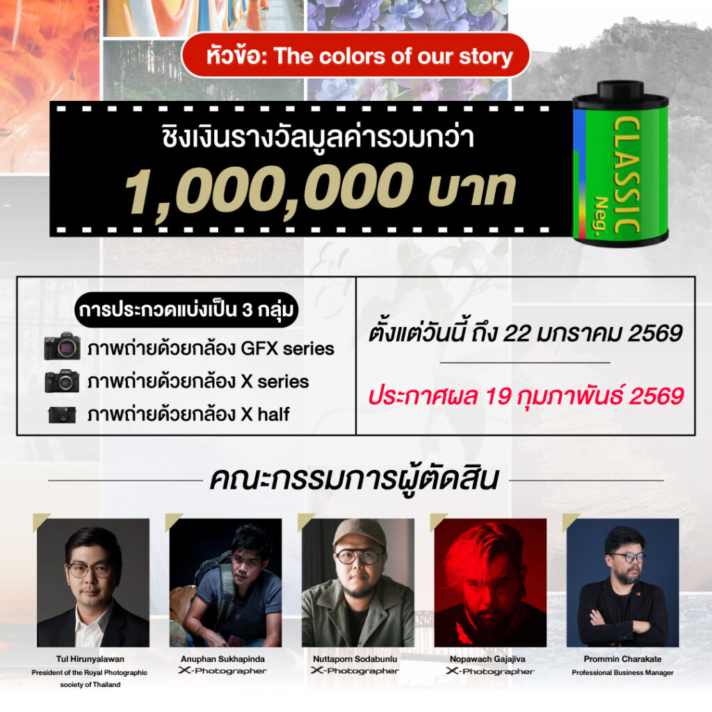 ฟูจิฟิล์ม เปิดแคมเปญยิ่งใหญ่แห่งปีของวงการภาพถ่าย Fujifilm Photo Contest 2025 ในหัวข้อ “The Colors of Our Story” ชวนช่างภาพโชว์ไอเดีย “สีสันแห่งเรื่องราว” ชิงรางวัลรวมกว่า 1 ล้านบาท