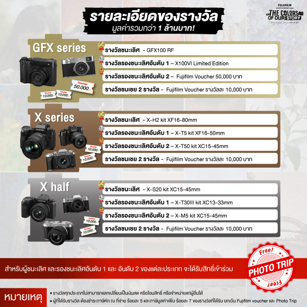 - รางวัลชมเชย (2 รางวัล): Fujifilm Voucher มูลค่า 10,000 บาท