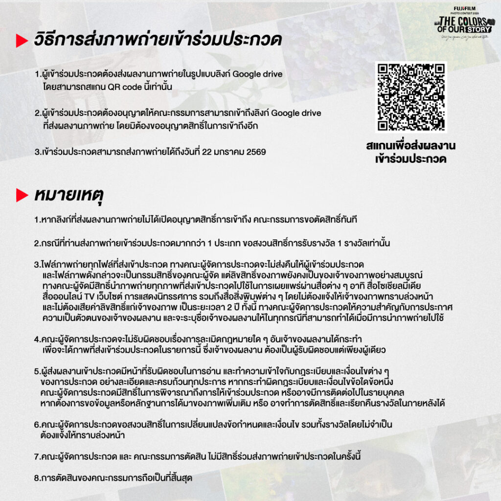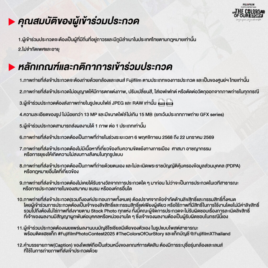 อย่าปล่อยให้โอกาสนี้หลุดมือ Fujifilm Photo Contest 2025 เปิดรับสมัครและส่งผลงานได้ตั้งแต่วันนี้ – 22 มกราคม 2569 และประกาศรายชื่อผู้ชนะในวันที่ 19 กุมภาพันธ์ 2569 ผ่านทางเพจ Facebook “Fujifilm X Thailand” ผู้ที่สนใจสามารถอ่านรายละเอียดการสมัคร กติกา และเงื่อนไขการประกวดเพิ่มเติมได้ที่ https://fujifilm-xspace.com/pages/fujifilm-photo-contest แล้วมาร่วมเป็นส่วนหนึ่งของสีสันที่โลกต้องจดจำ
