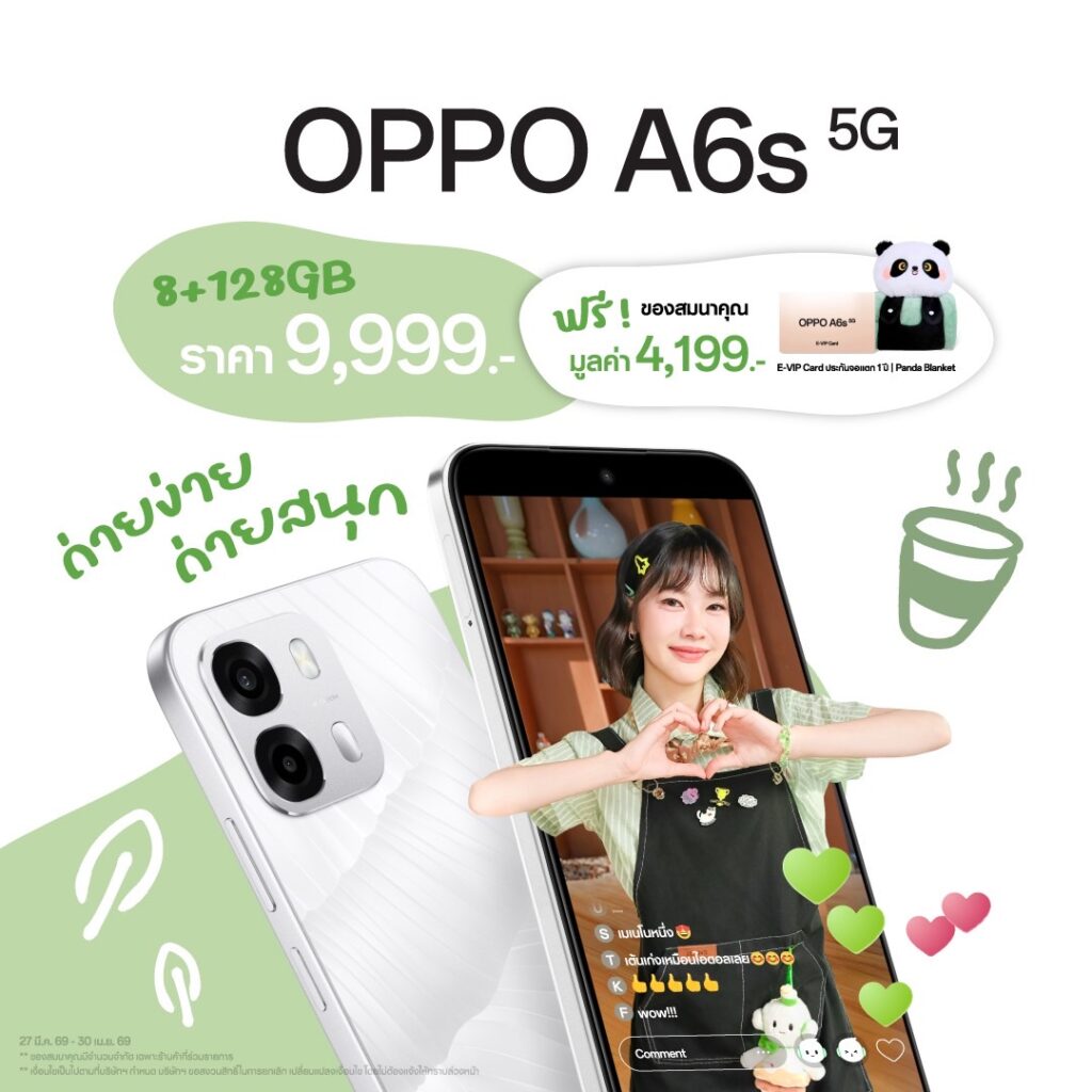 27 มีนาคม 2569 กรุงเทพฯ – OPPO ประกาศวางจำหน่ายอย่างเป็นทางการในประเทศไทยแล้วกับ “OPPO A6s 5G” รุ่นใหม่ล่าสุดจากตระกูลซีรีส์ A ที่มาภายใต้สโลแกน “A Step Ahead” สมาร์ตโฟนเพื่อนคู่ใจ ตอบโจทย์ทุกการใช้งาน มาพร้อม 2 ความจุ ได้แก่ OPPO A6s 5G (8+128GB) ในราคาเพียง 9,999 บาท และ OPPO A6s 5G (8+256GB) ในราคาเพียง 10,999 บาท พิเศษยิ่งกว่านั้น เมื่อซื้อภายในวันนี้ ถึง 30 เมษายน 2569 นี้ จะได้รับประกันจอแตก จํานวน 1 ครั้ง ภายในระยะเวลา 1 ปี (นับจากวันที่ซื้อเครื่อง) และ Panda Blanket จำนวน 1 ผืนมูลค่า 1,199 บาท