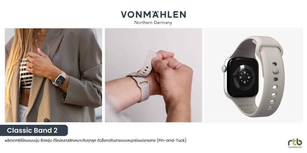 • VONMÄHLEN Classic Band 2 สายสำหรับ Apple Watch ดีไซน์คลาสสิกที่ผสานความเรียบหรูและฟังก์ชันการใช้งานอย่างลงตัว ผลิตจากซิลิโคนรีไซเคิลคุณภาพสูง ผิวเรียบนุ่ม ยืดหยุ่น และไม่ระคายเคืองผิว มาพร้อมช่องระบายอากาศด้านใน ช่วยให้อากาศไหลเวียนได้ดียิ่งขึ้น ลดความร้อนและเหงื่อสะสม ทำให้ข้อมือแห้งสบายตลอดทั้งวัน เหมาะสำหรับการใช้งานในชีวิตประจำวันและไลฟ์สไตล์สายแอคทีฟ ตัวล็อกแบบหมุดซ่อนปลายสาย (Pin-and-Tuck) ช่วยให้สวมใส่ได้กระชับและปรับขนาดได้ง่าย รองรับ Apple Watch ขนาด 40/41/42mm และ 44/45/46/49mm มีให้เลือก 3 สี ได้แก่ Black, Navy และ Cream วางจำหน่ายในราคา 890 บาท