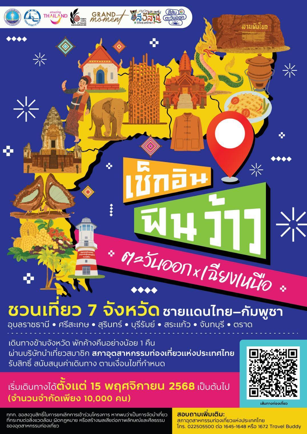 การท่องเที่ยวแห่งประเทศไทย จับมือสภาอุตสาหกรรมท่องเที่ยวแห่งประเทศไทย เปิดเส้นทางท่องเที่ยวสุดฟิน “เช็กอิน ฟิน ว้าว ตะวันออก X เฉียงเหนือ” กระตุ้นการเดินทางเชื่อมโยง 7 จังหวัดชายแดนไทย–กัมพูชา ได้แก่ อุบลราชธานี ศรีสะเกษ สุรินทร์ บุรีรัมย์ สระแก้ว จันทบุรี และตราด