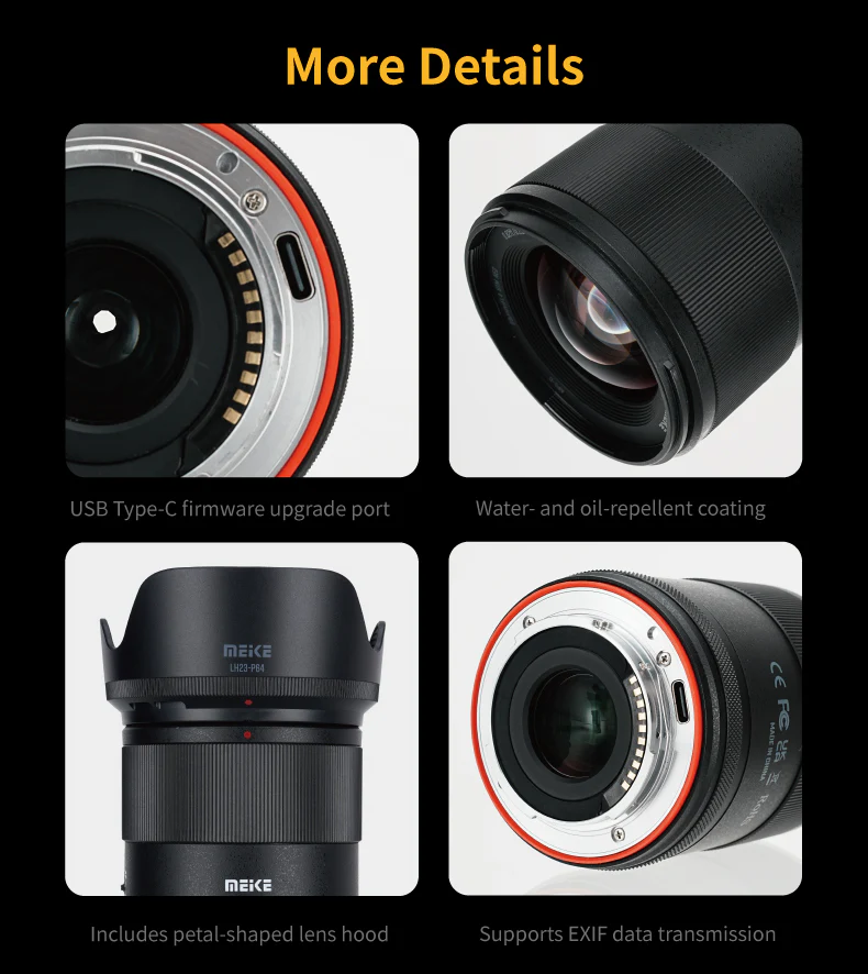 Meike AF 23mm f/1.4 APS-C ด้วยรูรับแสงกว้างถึง f/1.4 รองรับการใช้งานในที่แสงน้อยได้ดีเยี่ยม ให้โบเก้ที่มีขนาดใหญ่ นุมนวล เป็นธรรมชาติ ตัวเลนส์ได้รับการออกแบบให้เกิดดิสทอร์ชั่นต่ำมาก (Ultra-low distortion)​ ระบบออโต้โฟกัสทำงานเร็ว และเงียบด้วยมอเตอร์ STM รองรับการใช้งานร่วมกับระบบโฟกัสติดตามใบหน้า และดวงตา (eye / face detection​)​ รวมทั้งออกแบบให้เกิด focus breathing ต่ำมากสำหรับรองรับงานวิดีโอ มีขั้วสัมผัสไฟฟ้าสำหรับส่งข้อมูล Exif และยังมีพอร์ต USB-C​ สำหรับอัพเดทเฟิร์มแวร์ที่ท้ายกระบอกเลนส์ด้วย