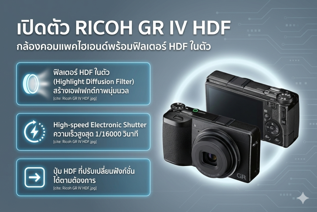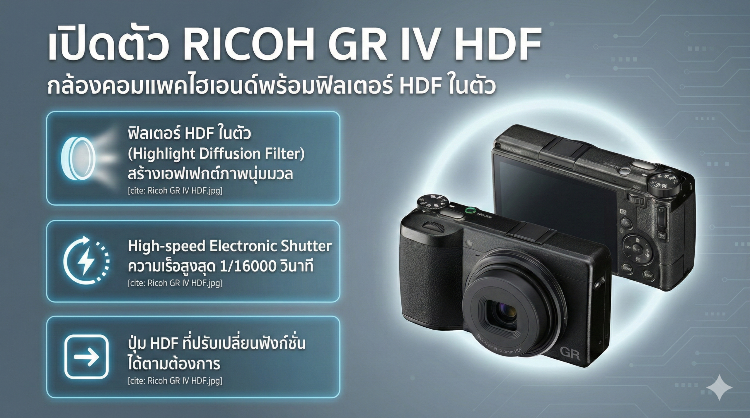 RICOH เปิดตัว GR IV HDF กล้องคอมแพคไฮเอนด์ที่มีพื้นฐานเดียวกับโมเดล GR IV รุ่นล่าสุด มาในบอดี้สีดำ และปุ่มชัตเตอร์สีพิเศษ grayish silver พร้อมฟิลเตอร์ HDF (Highlight Diffusion Filter) ในตัว