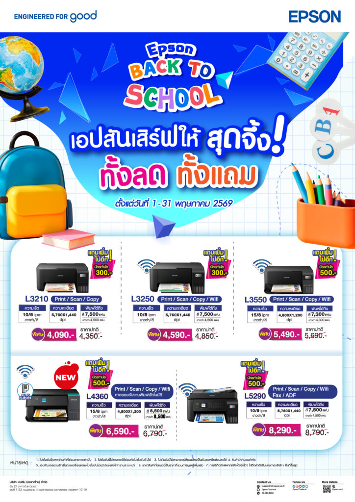 เอปสัน ประเทศไทย เดินหน้ากระตุ้นตลาดช่วงเปิดภาคเรียน เปิดแคมเปญ “Epson Back to School”อัดโปรทั้งลดทั้งแถม เอาใจนักเรียน นักศึกษา และผู้ปกครอง ด้วยไลน์อัพเครื่องพิมพ์ Epson EcoTank รุ่นยอดนิยมที่โดดเด่นด้านความประหยัดหมึก รองรับการพิมพ์ปริมาณมาก ครบทั้งพิมพ์ สแกน และถ่ายเอกสาร เริ่มตั้งแต่วันที่ 1–31 พฤษภาคม 2569 เมื่อซื้อสินค้าที่ร้านค้าที่ร่วมรายการ โดยรุ่นไฮไลต์ อาทิ L3210 ราคา 4,090 บาท, L3250 ราคา 4,590 บาท, L3550 ราคา 5,490 บาท, L4360 ราคา 6,590 บาท และ L5290 ราคา 8,290 บาท พร้อมรับบัตรกำนัลสูงสุด 500 บาท ตอบโจทย์ทั้งการเรียน การทำรายงาน และงานสร้างสรรค์ได้อย่างคุ้มค่า