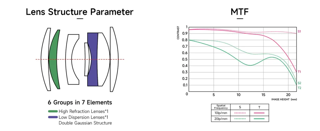 - โครงสร้างชิ้นเลนส์ 7 ชิ้นจัดเป็น 6 กลุ่ม (มีชิ้นเลนส์พิเศษ LD + HR)