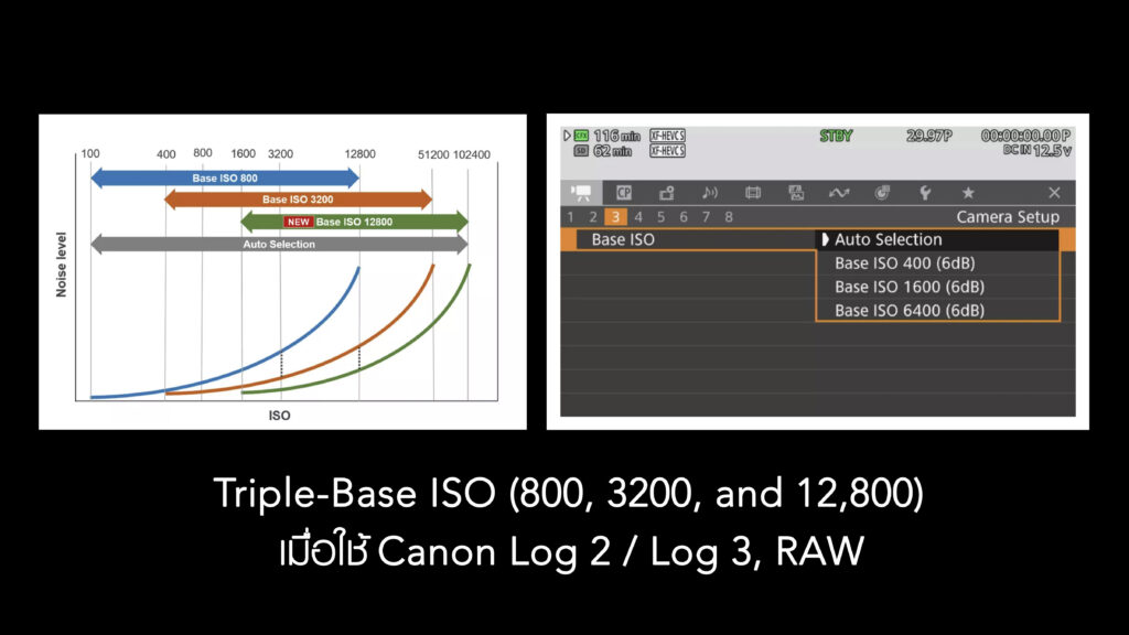 - ISO 800, 3200 และ 12800 (Canon Log2/ Log3/ RAW)