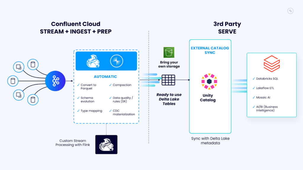 • รวมศูนย์การกำกับดูแลข้อมูล: การรองรับ Unity Catalog (GA) จะทำให้การเชื่อมต่อเมตาดาต้า (Metadata) สคีมา (Schema) และนโยบายการเข้าถึงข้อมูลระหว่าง Tableflow และ Databricks Unity Catalog เกิดขึ้นได้โดยอัตโนมัติ เพื่อให้การกำกับดูแลและการจัดการข้อมูลเป็นไปในทิศทางเดียวกัน และสอดคล้องกันทั่วทั้งองค์กร