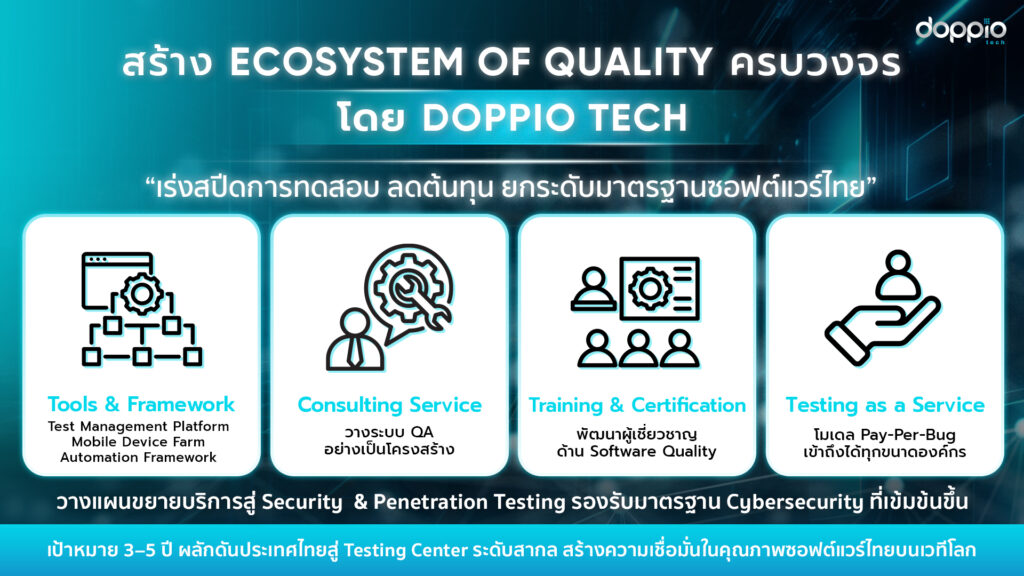 · สร้าง Ecosystem ด้าน Software Quality แบบครบวงจร: Doppio Tech มีแผนพัฒนา Ecosystem ครอบคลุมตั้งแต่ต้นน้ำถึงปลายน้ำได้แก่