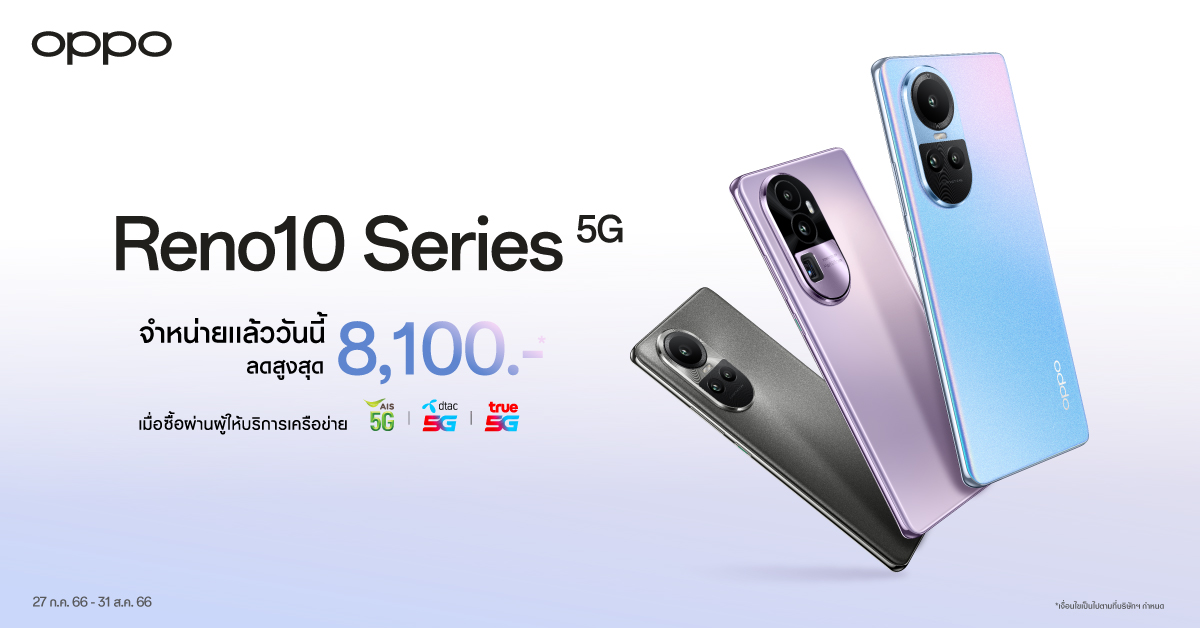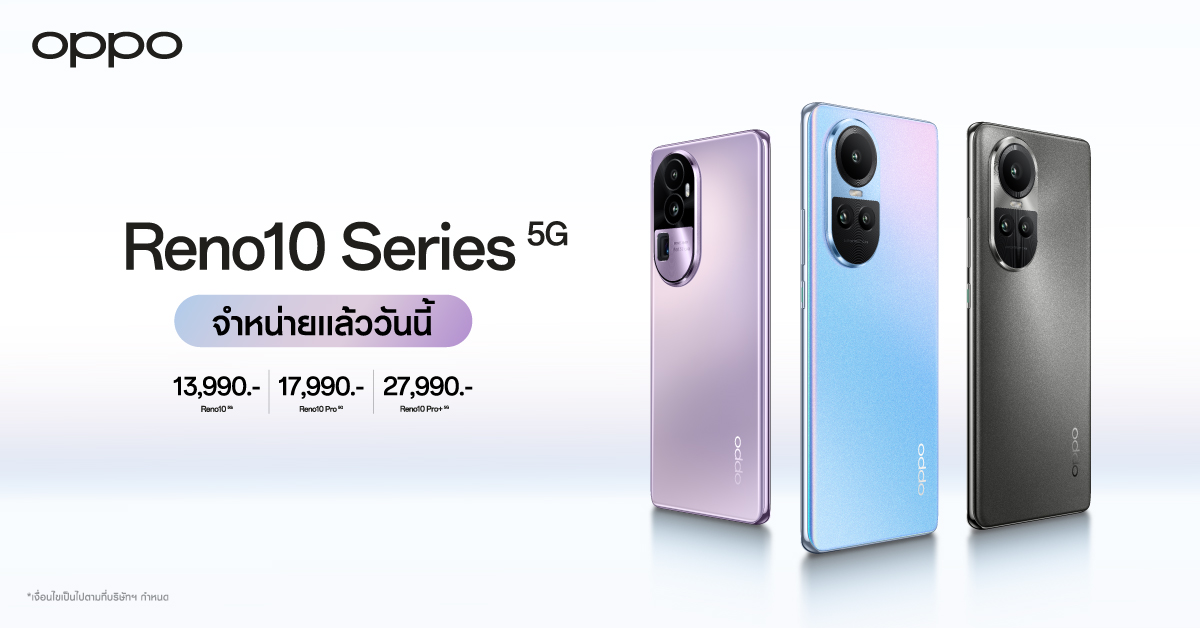 เป็นเจ้าของได้แล้ววันนี้กับ OPPO Reno10 Series 5G สมาร์ตโฟน The Portrait Expert ครั้งแรกที่มาพร้อมกล้องพอร์ตเทรตซูมได้ วางจำหน่ายใน 3 รุ่น ได้แก่ OPPO Reno10 5G วางจำหน่ายในราคา 13,990 บาท , OPPO Reno10 Pro 5G วางจำหน่ายในราคา 17,990 บาท และ OPPO Reno10 Pro+ 5G วางจำหน่ายในราคา 27,990 บาท และพิเศษเมื่อซื้อกับผู้ให้บริการเครือข่าย AIS ,dtac และ true รับส่วนลดสูงสุด 8,100 บาท สามารถไปทดลองสัมผัสและเป็นเจ้าของได้แล้วที่ OPPO Brand Shop และตัวแทนจำหน่ายทั่วประเทศ