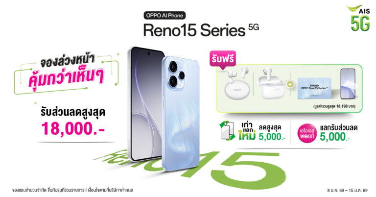 OPPO Reno15 Series 5G รุ่นใหม่ล่าสุด สมาร์ตโฟนเพื่อนซี้ เทรนดี้ทุก ช็อตพร้อมจับมือ AIS มอบโปรสุดคุ้ม รับส่วนลดสูงสุด 18,000 บาท