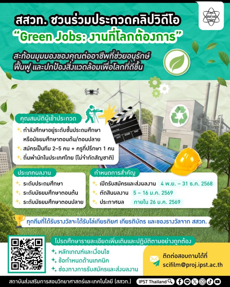 NEWS ประกวดคลิปวิดีโอเทศกาลภาพยนตร์วิทยาศาสตร์เพื่อการเรียนรู้ ครั้งที่ 21 หัวข้อ “Green Jobs: งานที่โลกต้องการ” อ่านเพิ่ม » Lekbluearrow November 4, 2025 5:20 pm