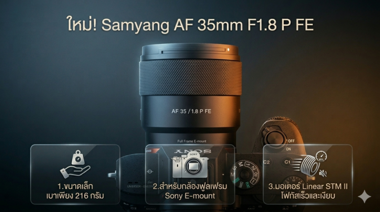 NEWS ใหม่! Samyang AF 35mm f/1.8 P FE เลนส์มุมกว้างน้ำหนักเบาสำหรับกล้องฟูลเฟรม อ่านเพิ่ม » Lekbluearrow March 29, 2026 3:06 pm